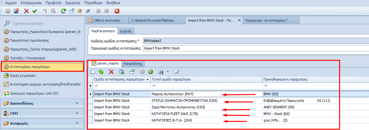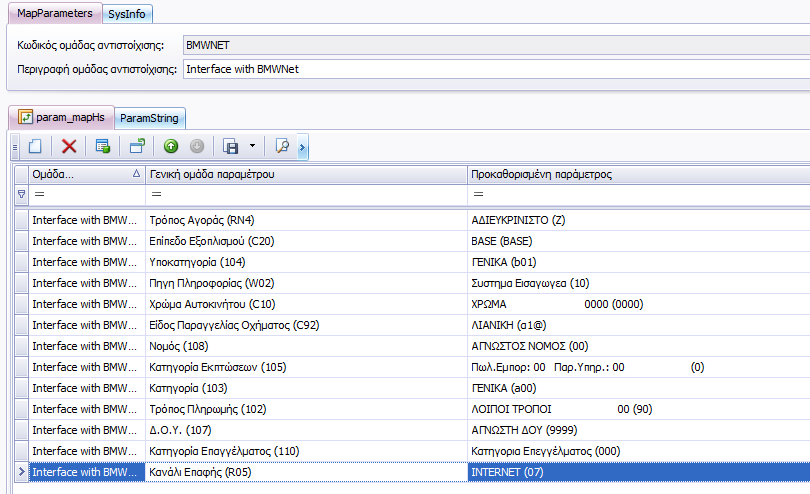 Για να κάνουμε την αντιστοίχιση, πάμε στο μενού -> Παράμετροι -> Αντιστοίχιση παραμέτρων -> Interface with BMWNet.