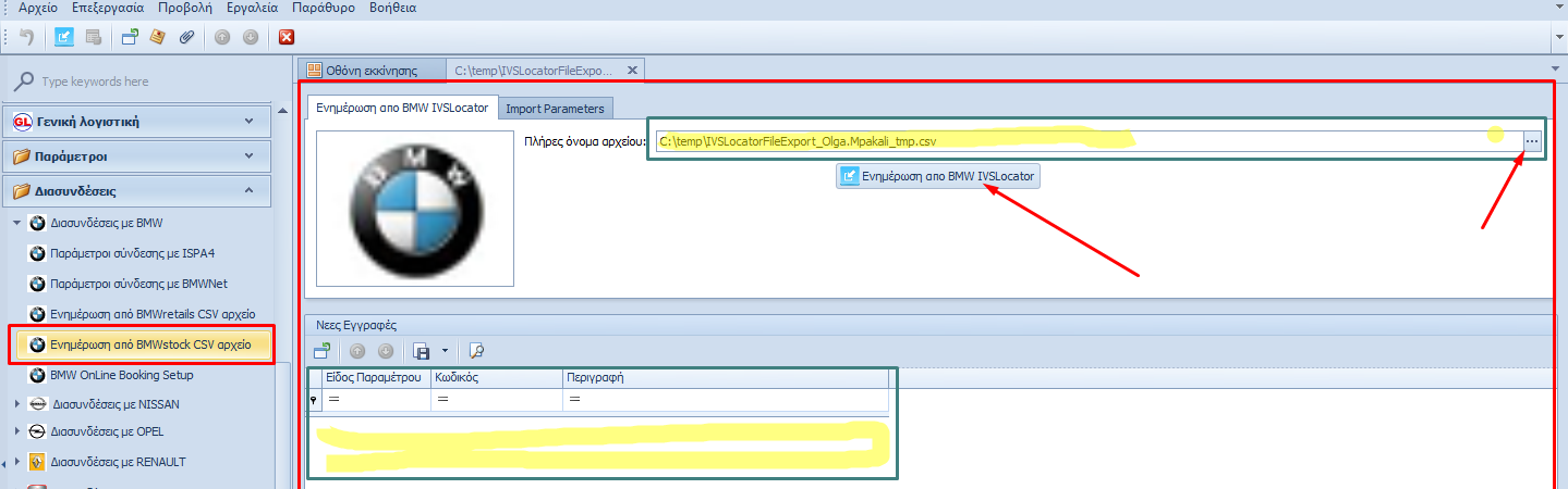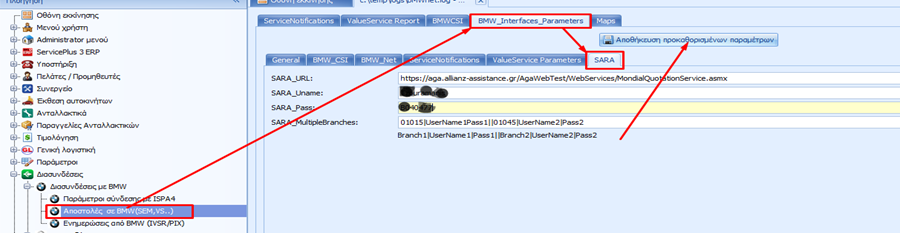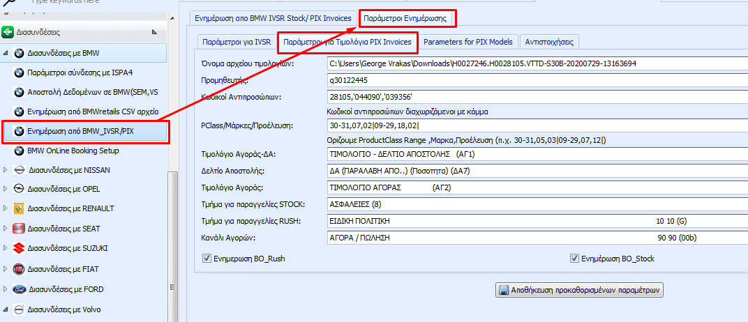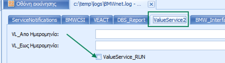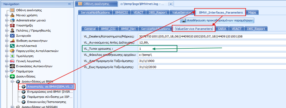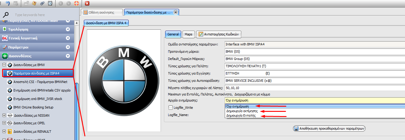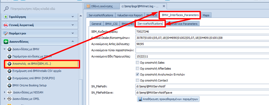 Η επιλογή βρίσκεται στο κεντρικό μενού/Διασυνδέσεις και πρέπει να οριστούν οι παράμετροι στο TAB “BMW_Interfaces Parameters/ServiceNotificatons”. Πρέπει να οριστούν τα κάτωθι: