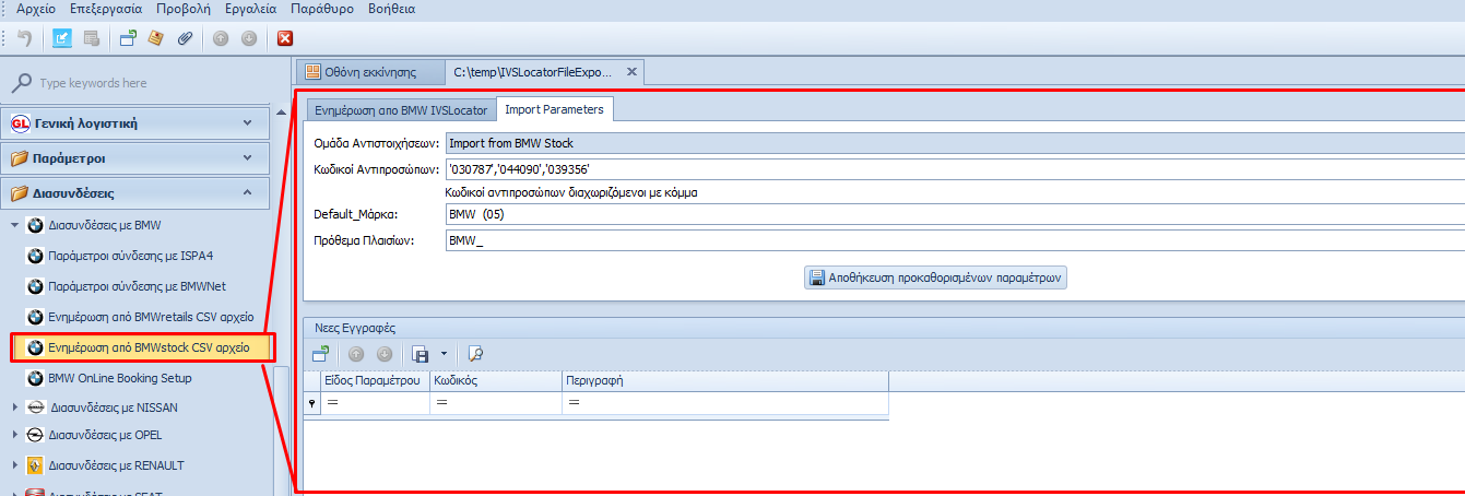 Εδώ οριζουμε τους κωδικους αντιπροσώπου που εχουμε από την BMW, τα καταστήματα τα οποια σχετιζονται με