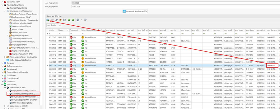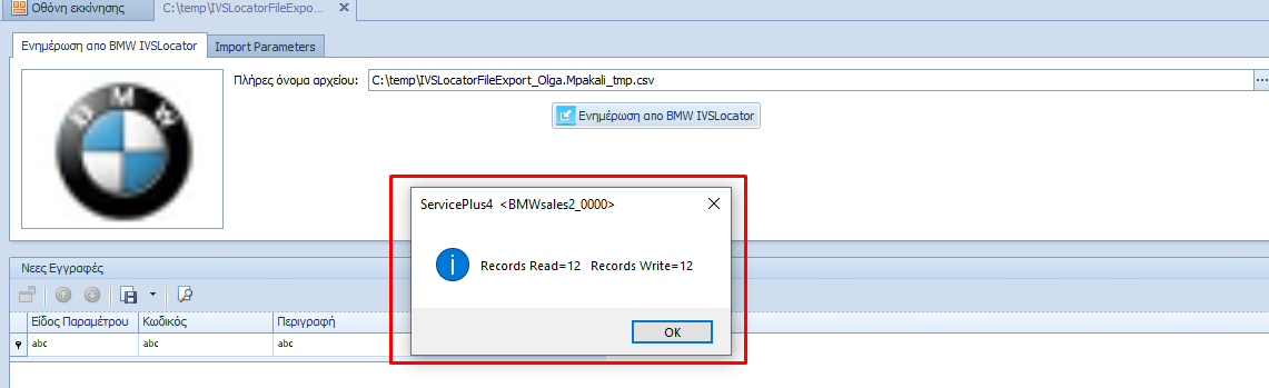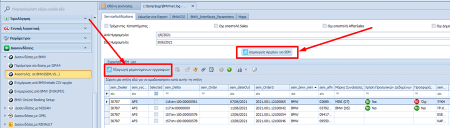 Κατά την αποστολη μπορούμε να επιλεξουμε εάν θελουμε εγγραφές του τρεχοντος υποκαταστήματος ή ολες μαζι, εάν δεν θελουμε να σταλουν εγγραφές του AfterSales, εάν δεν θελουμε να σταλουν εγγραφές του Sales και εάν θέλουμε απλα να δουμε τις εγγραφές χωρις να δημιουργηθούν αρχεια. Η τελευταία επιλογη μας δινει την δυνατότητα να ελεγξουμε όλα τα δεδομενα πριν τα στειλουμε στην BMW.