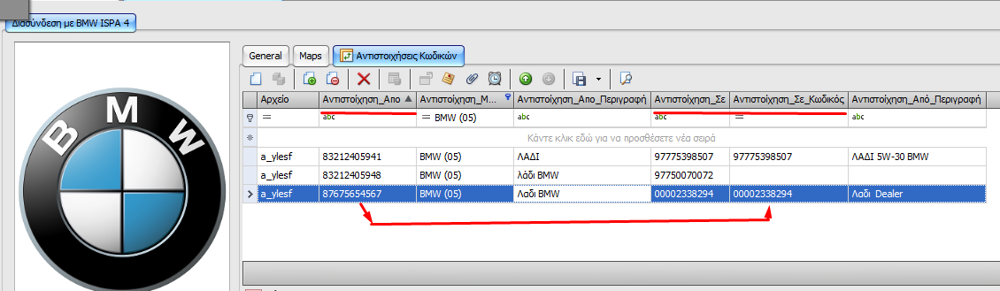 Στο DMS υπάρχει η δυνατότητα αντιστοίχισης κάποιων κωδικών ανταλλακτικών ή εργασιών που χρησιμοποιούνται στο ISPA με άλλους κωδικούς που χρησιμοποιεί ο Dealer.