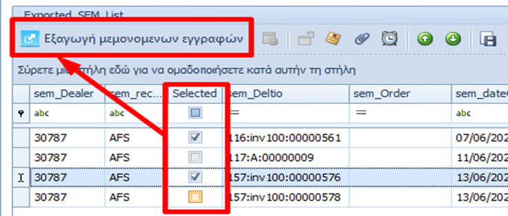 Για να στείλουμε μεμονωμένες εγγραφες «τικαρουμε» το σχετικο πεδιο επιλογής για οσες εγγραφές θελουμε να ξαναστείλουμε και επιλέγουμε το «Εξαγωγή μεμονωμένων εγγραφών»