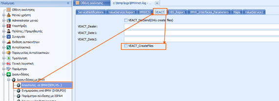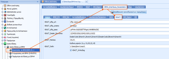 Η διαδικασία αυτή δημιουργει αρχεια τυπου CSV για αποστολή στην VEACT. Στην παραμετροποιηση της διαδικασίας πρεπει να ορισουμε, τα καταστηματα που θα συμμετέχουν καθως και τις μαρκες αυτοκινητων. Ο Ορισμος των καταστηματων συσχετιζονται με τον κωδικο Dealer BMW (DealerCode1|Branch1, Branch2, Branch3|| DealerCode2|Branch4, Branch5) π.χ.