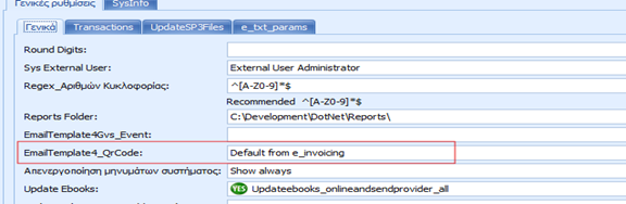 αποστολή ενός παραστατικού με E-Mail ή με SMS, πρέπει να υπάρχει καταχωρημένο email στο “E-Mails για e_invoicing” και Κινητό στο πεδίο “Mobile για αποστολή QrCode