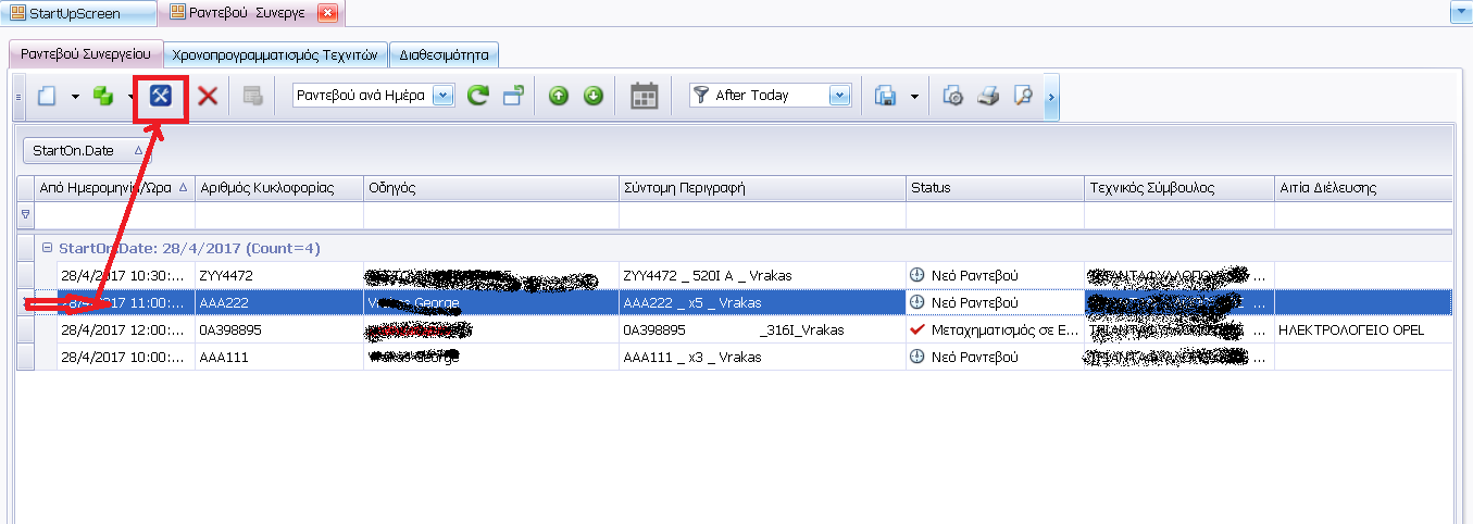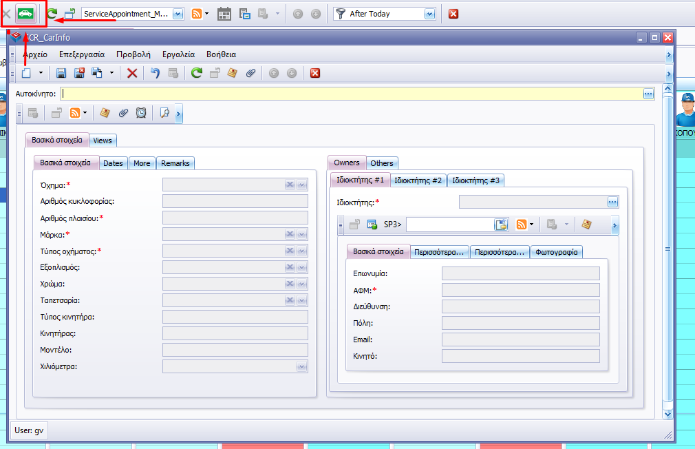 Η αναζήτηση του αυτοκινήτου γίνεται από το πεδίο «Αυτοκίνητο» ή από την επιλογή που εμφανίζεται στο πάνω αριστερό μέρος της οθόνης. Αφού επιλέξουμε κάποιο αυτοκίνητο από την λίστα των αυτοκινήτων, εμφανίζονται οι πληροφορίες αυτοκινήτου/Πελάτη Εάν το αυτοκίνητο δεν υπάρχει. Μπορούμε να δημιουργήσουμε ένα ραντεβού με το ελάχιστο των στοιχείων που απαιτούνται (Μάρκα, Αριθμός κυκλοφορίας, Επωνυμία πελάτη/Οδηγού).