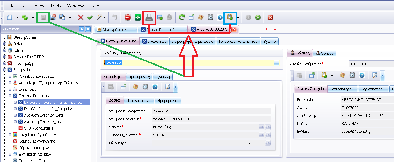 Στην οθόνη αναζήτησης, βλέπουμε όλες τις πληροφορίες αυτοκινήτου/Πελάτη καθώς και πολλές άλλες πληροφορίες που είναι διαθέσιμες (Ιστορικό, καμπάνιες ανάκλησης, κάρτες καυσαερίων, εκτιμήσεις κλπ.)