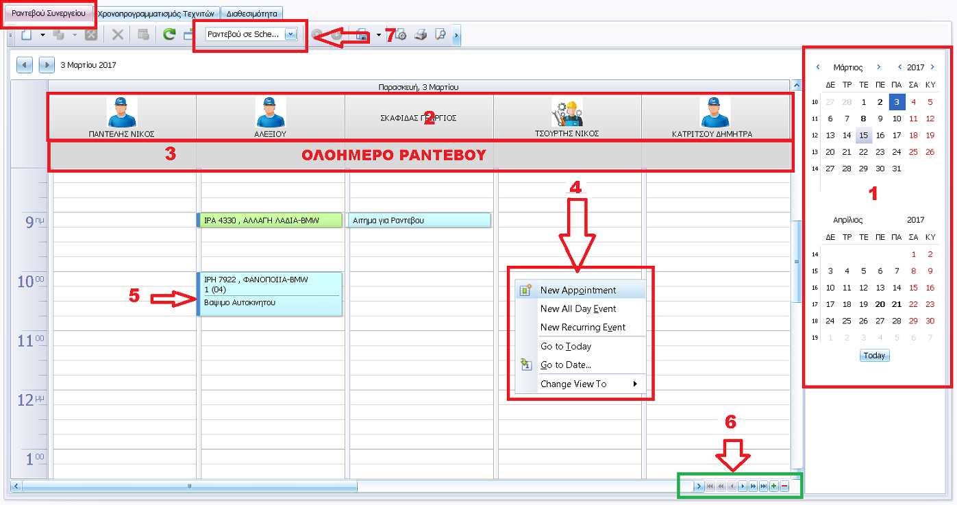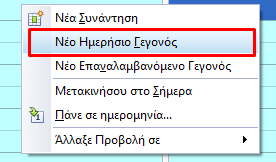 από τις επιλογές μπορούμε να δημιουργήσουμε ένα ΝΕΟ ραντεβού ή ένα Ολοήμερο ραντεβού ή ένα Επαναλαμβανόμενο ραντεβού ή να μεταφερθούμε σε κάποια άλλη ημερομηνία ή να αλλάξουμε την εμφάνιση των ραντεβού στην οθόνη.