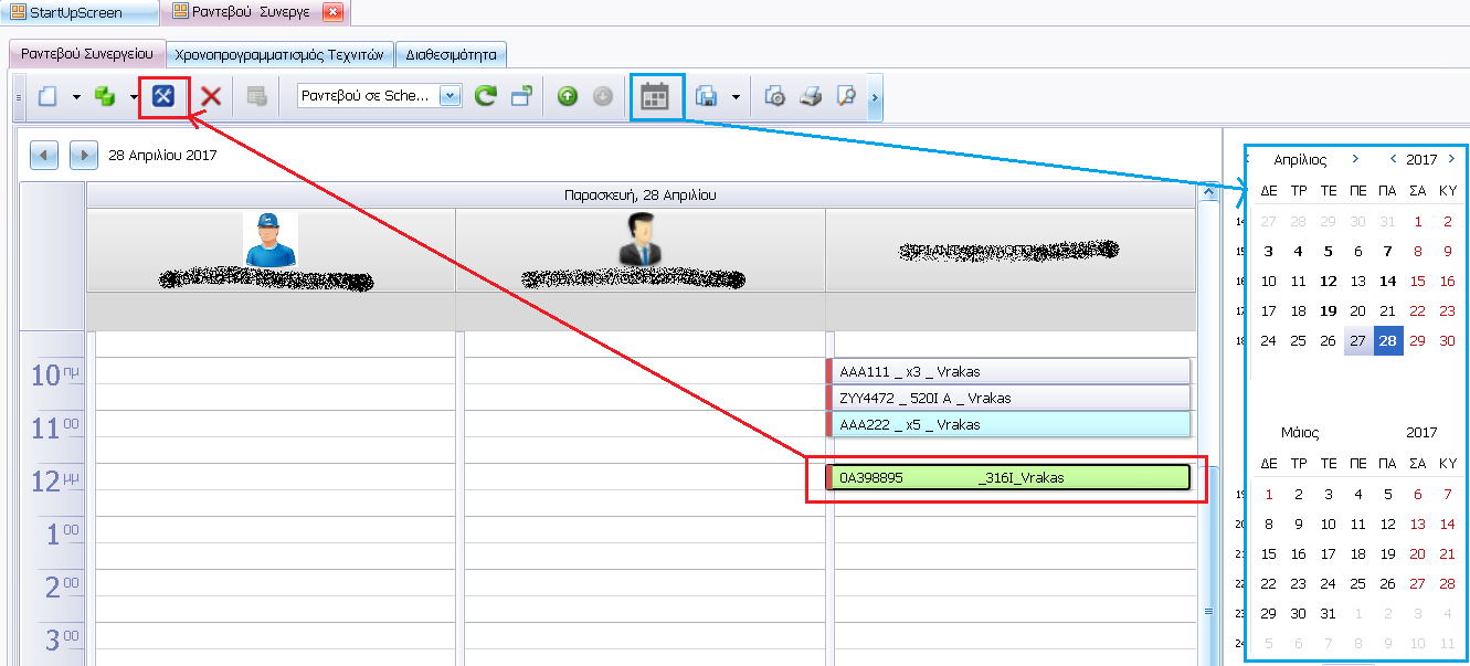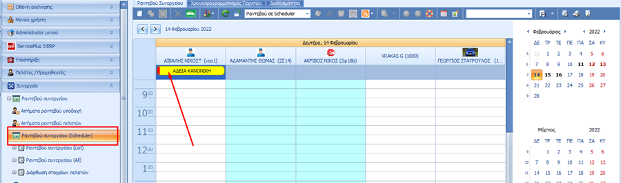 Στον Scheduler, εμφανίζεται ο εργαζόμενος εχοντας στο πανω μερος της οθόνης την ενδειξη της απουσίας του. Δεν μπορούμε να καταχωρίσουμε ραντεβού σε εργαζόμενο για ημερομηνία που εχει δηλωθεί απουσία.Οι τεχνίτες που έχουν δηλωθεί απόντες δεν εμφανίζονται στην χρονόληψη τις ημέρες απουσίας τους.