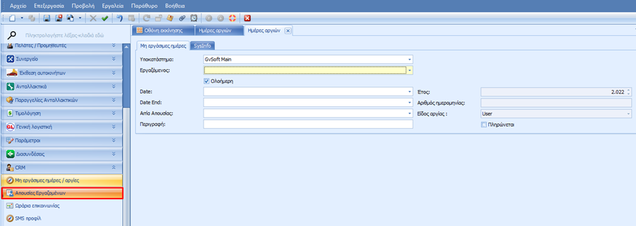 Οι διαχείριση των απουσιών βρισκεται στο μενου CRM.