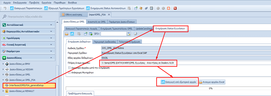Η διαδικασία ενημέρωσης των αυτοκινήτων βρίσκεται στις διασυνδέσεις με OPEL και γινεται με την χρηση Excel το οποίο κατεβάζουμε από το SAP και περιεχει τις παραγγελιες αυτοκινήτων που εχουμε στείλει στην OPEL.