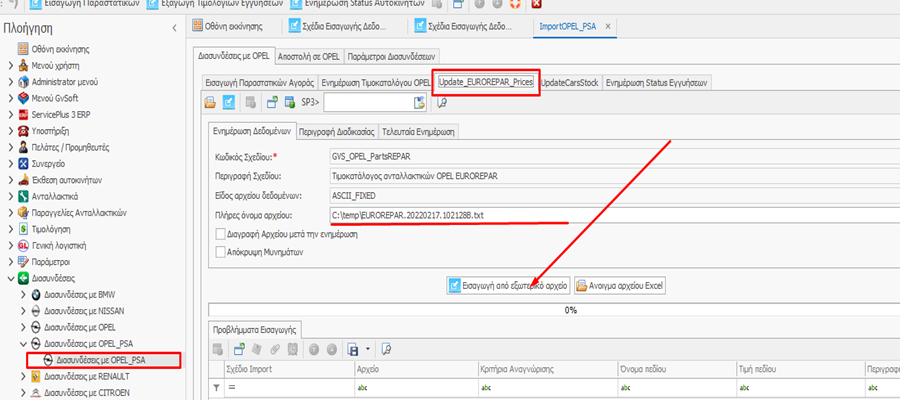 Για την ενημέρωση των τιμών, επιλέγουμε το αρχείο που έχουμε κατεβάσει από το σύστημα της OPEL πατάμε την ενημέρωση.