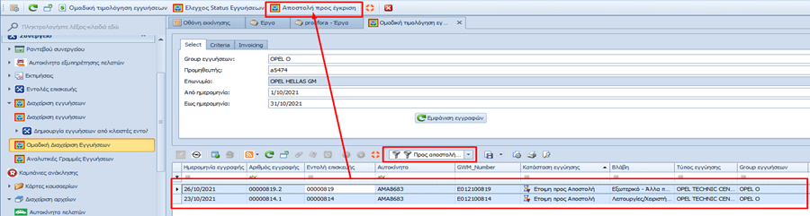Όταν δημιουργείται μια αιτηση εγγυησης μετα το κλεισιμο της εντολής επισκευης, μπαινει σε κατασταση ‘Νεα Εγγυηση’ θα πρεπει ο υπευθυνος να μπει σε κάθε μια να συμπληρώσει τυχόν πληροφορίες που χρειάζονται (π.χ. κωδικο βλαβης, κλπ) και να την χαρακτηρίσει ‘Ετοιμη για Αποστολή’