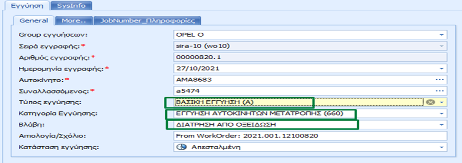 - Κατηγορία Εγγύησης. Ανάλογα με τον τύπο εγγύησης εμφανιζονται οι διαθεσιμες «Κατηγορίες εγγυησης» όπως εχουν οριστεί από την OPEL από όπου επιλέγουμε μια.