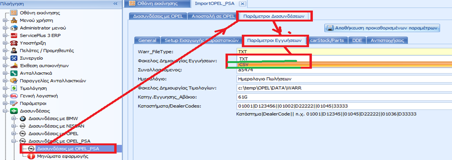 Στους Παραμέτρους Εγγυήσεων ορίζουμε τον φάκελο δημιουργίας του αρχείου για την αποστολή των εγγυήσεων, τον φάκελο δημιουργίας του αρχείου τιμολογίων για την αποστολή, το ημερολόγιο για την επιλογη των παραστατικών, τον κωδικο πελατη στον οποιο τιμολογούμε, τα καταστήματα που στελνουν εγγυήσεις με τους κωδικους Dealer για κάθε καταστημα. Πρεπει να ορισουμε εδώ όλα τα καταστήματα. Τα καταστηματα διαχωρίζονται με το || μετα τον κωδικο κάθε καταστήματος βαζουμε το | και στη συνεχεια τον κωδικο Dealer για τις εγγυήσεις. Π.χ. για το καταστημα 01001 που εχει κωδικο Dealer D12345, πρεπει να βαλουμε 01001|D12345||