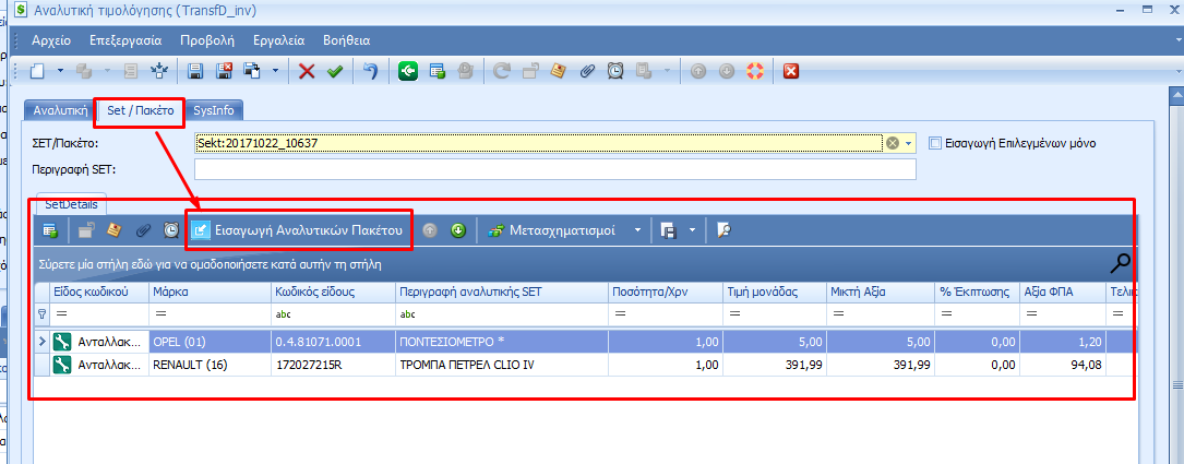 Για τα ανταλλακτικά, για κάθε κωδικό που καταχωρείται, εμφανίζονται χρήσιμες πληροφορίες για τον κωδικό. Για τη γρήγορη καταχώρηση κωδικών, μπορεί να χρησιμοποιηθεί η δυνατότητα ενσωμάτωσης πακέτων ή Baskets τα οποία έχουν προηγουμένως προετοιμαστεί.