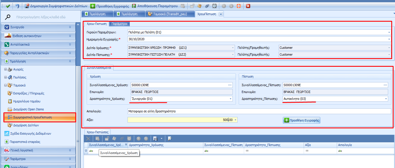 Με την εργασία αυτή μπορούμε να μεταφέρουμε αξίες από λογαριασμό σε λογαριασμό για τακτοποίηση τους. Π.χ. Μπορούμε να μεταφέρουμε μια αξία για τον ίδιο πελάτη σε άλλη δραστηριότητα, ή αξία από έναν πελάτη σε άλλο ή από πελάτη σε προμηθευτή. Μπορούμε να κάνουμε οποίους συνδυασμούς απαιτούνται για την τακτοποίηση εκκρεμοτήτων.