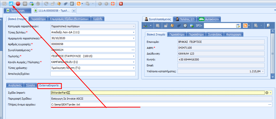 Αφού επιλέξουμε το σχέδιο Import και το αρχείο στο δίσκο, από τη σχετική επιλογή, γίνεται εισαγωγή των δεδομένων του αρχείου στο παραστατικό.