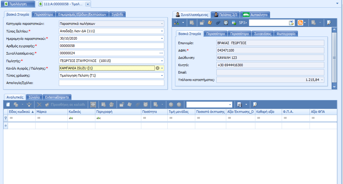 Με την ολοκλήρωση των αναλυτικών γραμμών του παραστατικού, αποθηκεύουμε το παραστατικό και στη συνέχεια ανάλογα με την παραμετροποίηση, αυτό εκτυπώνεται ή μεταφερόμαστε στη διαδικασία του ταμειακού μέρους του παραστατικού.