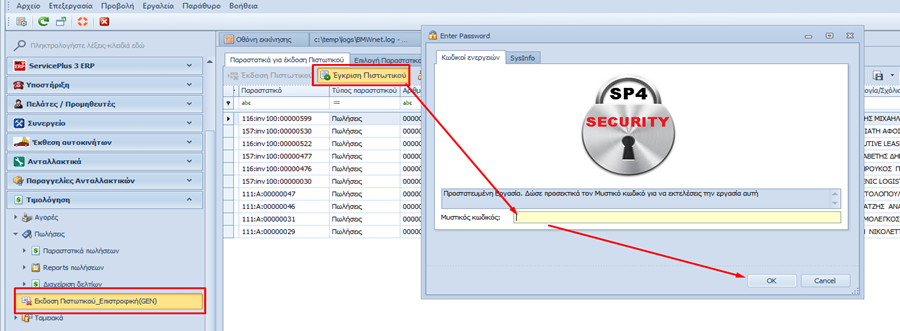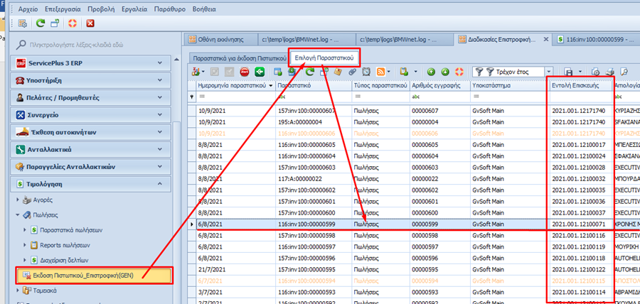 Από τη λίστα αυτή μπορούμε (Εάν χρειάζεται) να εκδώσουμε ειδικό ακυρωτικό, ή να επανεκτυπώσουμε ένα παραστατικό, ή να πραγματοποιήσουμε επανενημέρωση της λογιστικής ή να μετασχηματίσουμε ένα παραστατικό σε κάποιο άλλο.