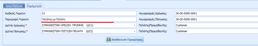 Με κάθε Συμψηφιστική Χρεοπίστωση δημιουργούνται στην ουσία δυο εγγραφές και είναι ανάλογα με τα δελτία που θα έχουμε επιλέξει για την εγγραφή. Πριν κάνουμε εγγραφές, θα πρέπει να έχουμε ορίσει τους συνδυασμούς που θέλουμε να κάνουμε και να αντίστοιχα δελτία που θα δημιουργούνται κάθε φορά. Για να δημιουργήσουμε ένα νέο συνδυασμό, μπορούμε να το κάνουμε στην ίδια οθόνη στο TAB ‘Παράμετροι’, όπου επιλέγουμε ένα κωδικό και μια περιγραφή του συνδυασμού. Το δελτίο χρέωσης και το δελτίο πίστωσης, του λογαριασμούς λογιστικής για την χρέωση και την πίστωση και το είδος του συναλλασσόμενου (Πελάτης/Προμηθευτής) για την χρέωση και την πίστωση.
