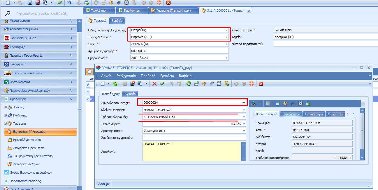 Εκτός της καταχώρισης ταμειακής κίνησης μαζί με κάποιο παραστατικό, μπορούμε να καταχωρήσουμε ταμειακές κινήσεις ανεξάρτητες, π.χ. για μια προκαταβολή ή μια εξόφληση προηγούμενης οφειλής.