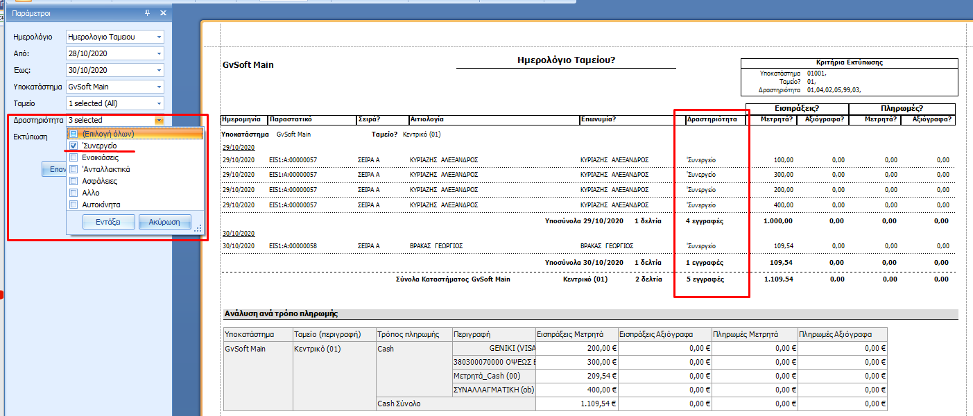 Στο ημερολόγιο ταμείου μπορούμε να επιλέξουμε εγγραφές από διαφορετικά υποκαταστήματα, διαφορετικά ταμεία, διαφορετικές δραστηριότητες.