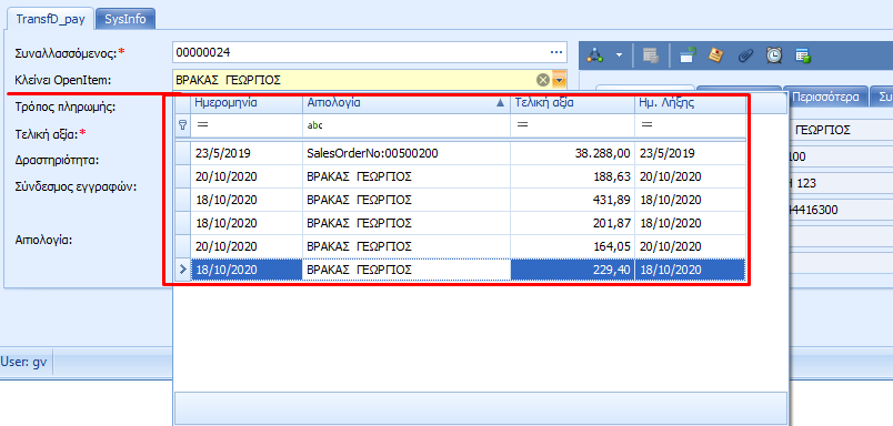 Κατά την καταχώριση μια ταμειακής εγγραφής μπορούμε να επιλέξουμε και να συνδέσουμε την εγγραφή με κάποιο ανοιχτό τιμολόγιο (Open Items) και έτσι να κλείσει η εκκρεμότητα του ανοιχτού τιμολογίου.