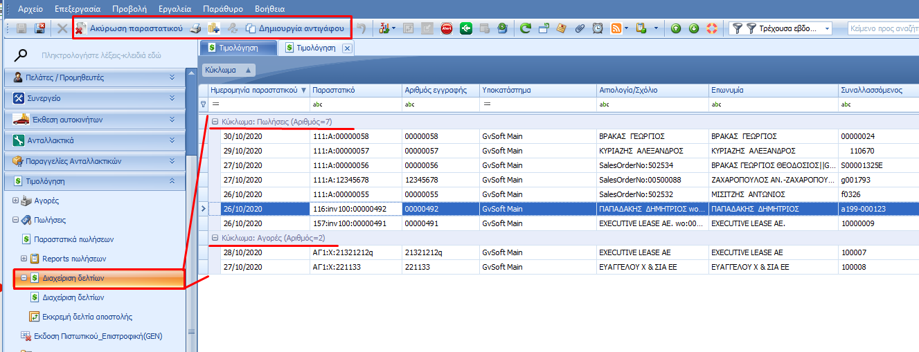 Από τη λίστα αυτή μπορούμε (Εάν χρειάζεται) να εκδώσουμε ειδικό ακυρωτικό, ή να επανεκτυπώσουμε ένα παραστατικό, ή να πραγματοποιήσουμε επανενημέρωση της λογιστικής ή να μετασχηματίσουμε ένα παραστατικό σε κάποιο άλλο.