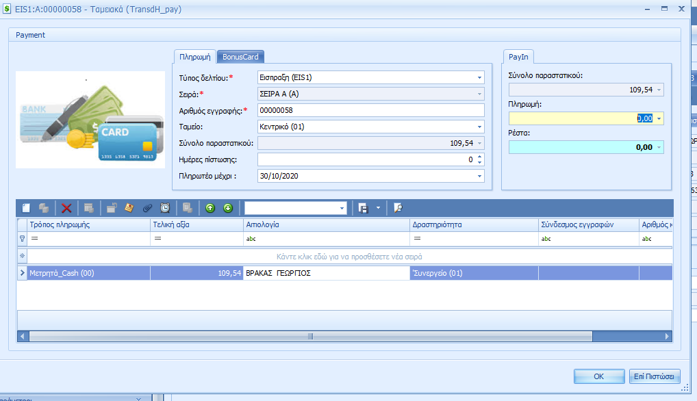 Στο ταμειακό, μπορεί να επιλέξουμε πολλαπλούς τρόπους εξόφλησης του παραστατικού. Σαν τρόπο εξόφλησης μπορεί να χρησιμοποιηθεί και η εξαργύρωση πόντων από την κάρτα Bonus που μπορεί να έχει ο πελάτης.