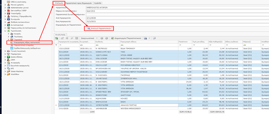 Για τα ανταλλακτικά, για κάθε κωδικό που καταχωρείται, εμφανίζονται χρήσιμες πληροφορίες για τον κωδικό. Για τη γρήγορη καταχώρηση κωδικών, μπορεί να χρησιμοποιηθεί η δυνατότητα ενσωμάτωσης πακέτων ή Baskets τα οποία έχουν προηγουμένως προετοιμαστεί.